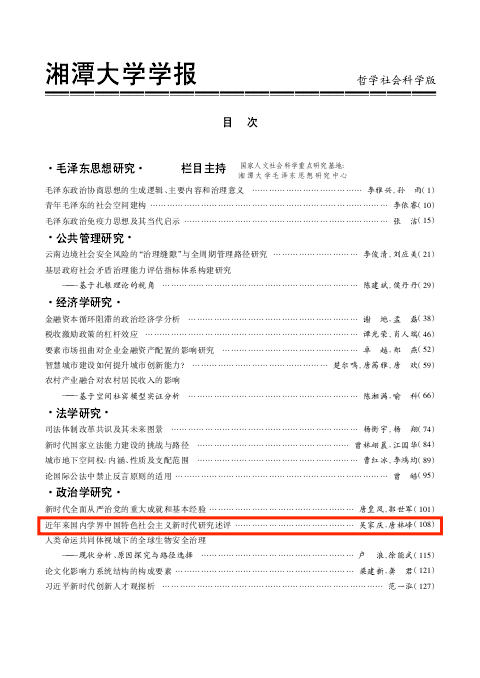 外围买球app官网教师吴家庆教授、博士研究生唐林峰在《湘潭大学学报(哲学社会科学版)》(2022年第2期)上发表学术论文《近年来国内学界中国特色社会主义新时代研究述评》。《湘潭大学学报(哲学社会科学版)》由中国自然辨证法研究会主办,是由湖南省教育厅主管、湘潭大学主办的以反映本校文科教学科研成果为主的综合性学术理论刊物,是全国中文核心期刊,CSSCI来源期刊。