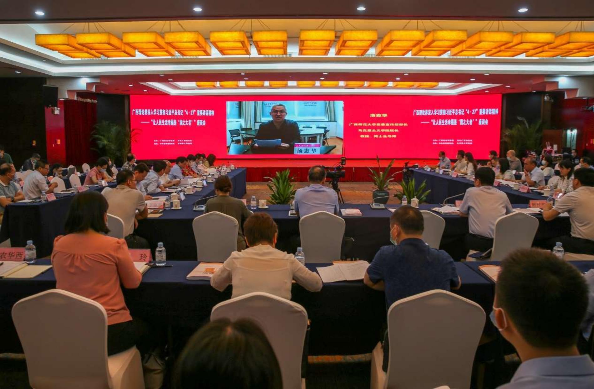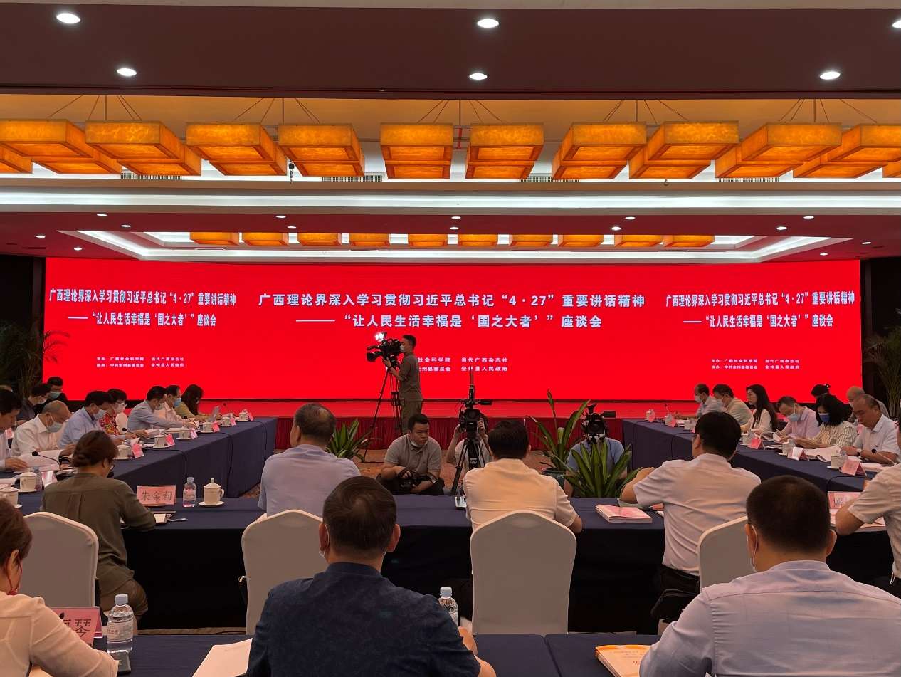 4月24日,广西理论界以“让人民生活幸福是‘国之大者’”为主题,分别在南宁和桂林全州县召开座谈会。广西区内高校外围买球的app十大平台、党校(行政学院)、干部学院、科研院所的专家学者代表80多人出席了会议。广西壮族自治区党委宣传部副部长赵勇富在主会场出席会议并致辞。当代广西杂志社社长、总编辑刘波主持主会场会议。