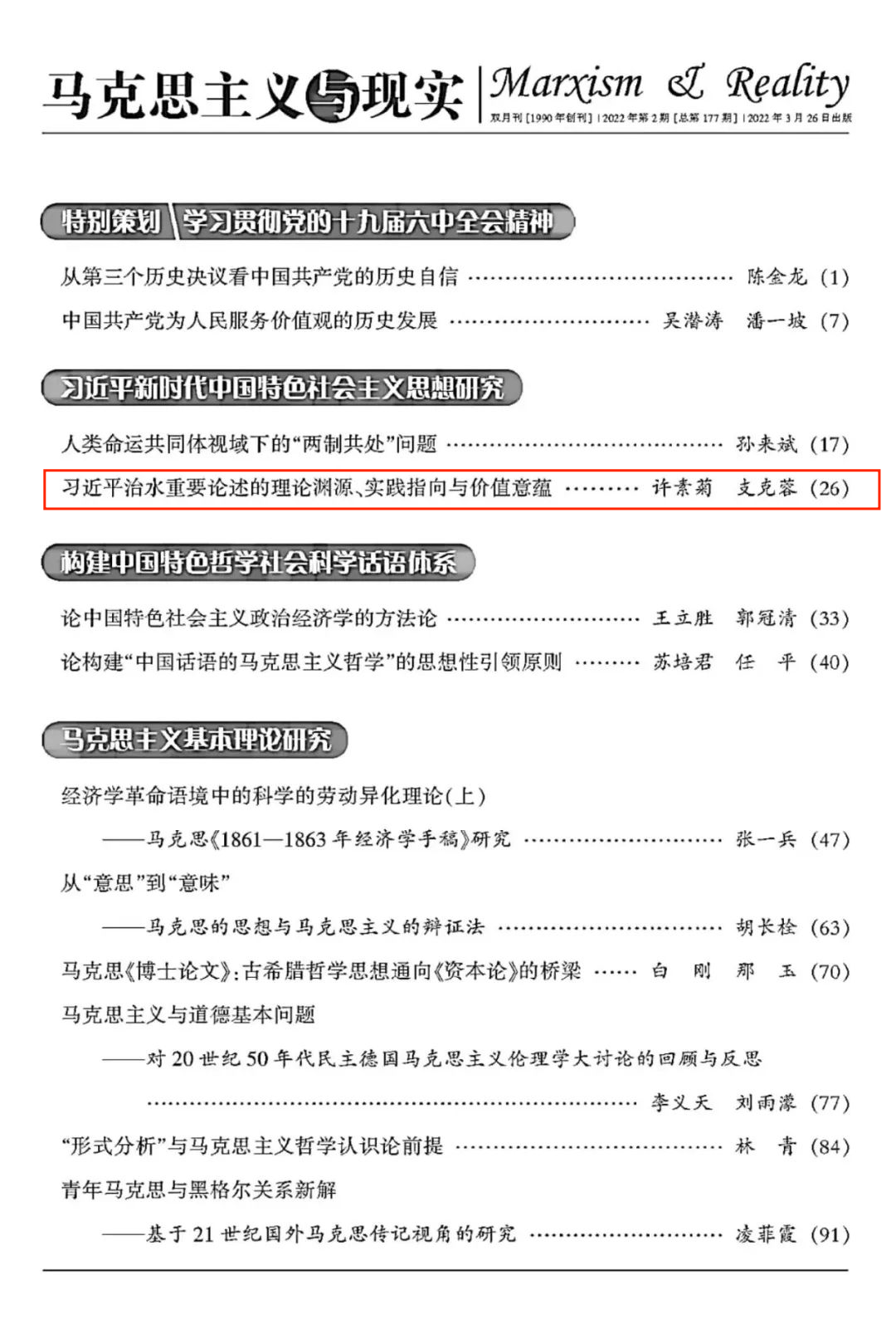外围买球app官网教师许素菊教授、博士研究生支克蓉在《马克思主义与现实》(2022年第2期)上发表学术论文《习近平治水重要论述的理论渊源、实践指向与价值意蕴》。《马克思主义与现实》是由中央党史和文献研究院主管主办、中央编译出版社出版发行,是重点研究马克思主义理论的专业性学术刊物。此刊作为2017年度中国百强报刊、国家社科基金首批资助期刊、全国中文核心期刊、中国人文社会科学核心期刊、中文社会科学引文索引来源期刊(CSSCI),在学术界和理论界占有重要地位,并为广大读者所关注。