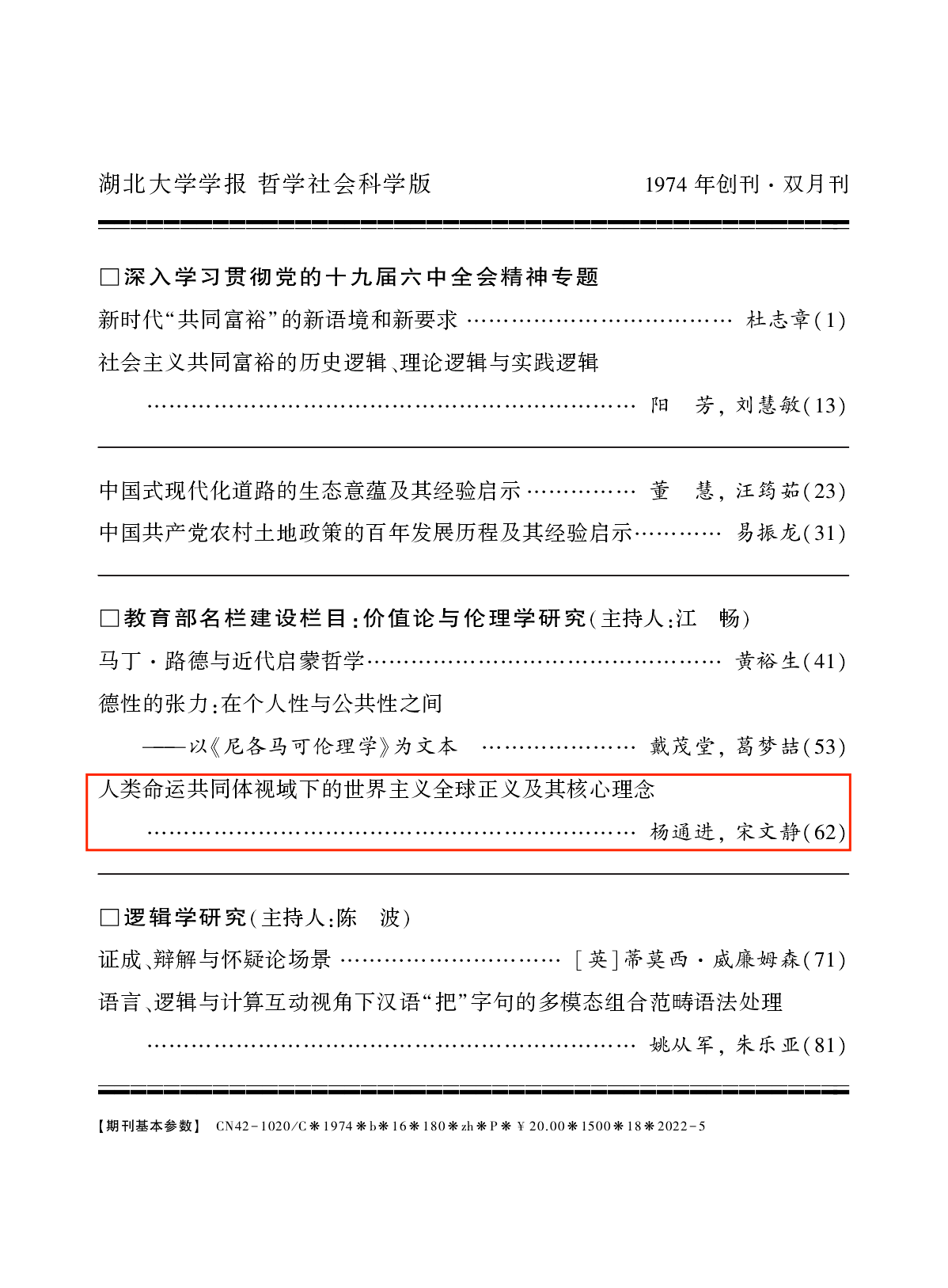 外围买球app官网教师杨通进教授、博士研究生宋文静在《湖北大学学报(哲学社会科学版)》(2022年第3期)上发表学术论文《人类命运共同体视域下的世界主义全球正义及其核心理念》。《湖北大学学报(哲学社会科学版)》是湖北大学主办的国内外公开发行的综合性学术理论刊物。期刊涵盖哲学、伦理学、政治经济学、语言文学、美学艺术、心理学、教育学、管理学、新闻学等重要学术领域,是湖北大学的重要思想文化阵地和学术窗口。本刊被评为中国人文社会科学学报核心期刊,全国综合性人文、社会科学类核心期刊,中文社会科学引文索引(CSSCI)来源期刊,全国百强社科学报。