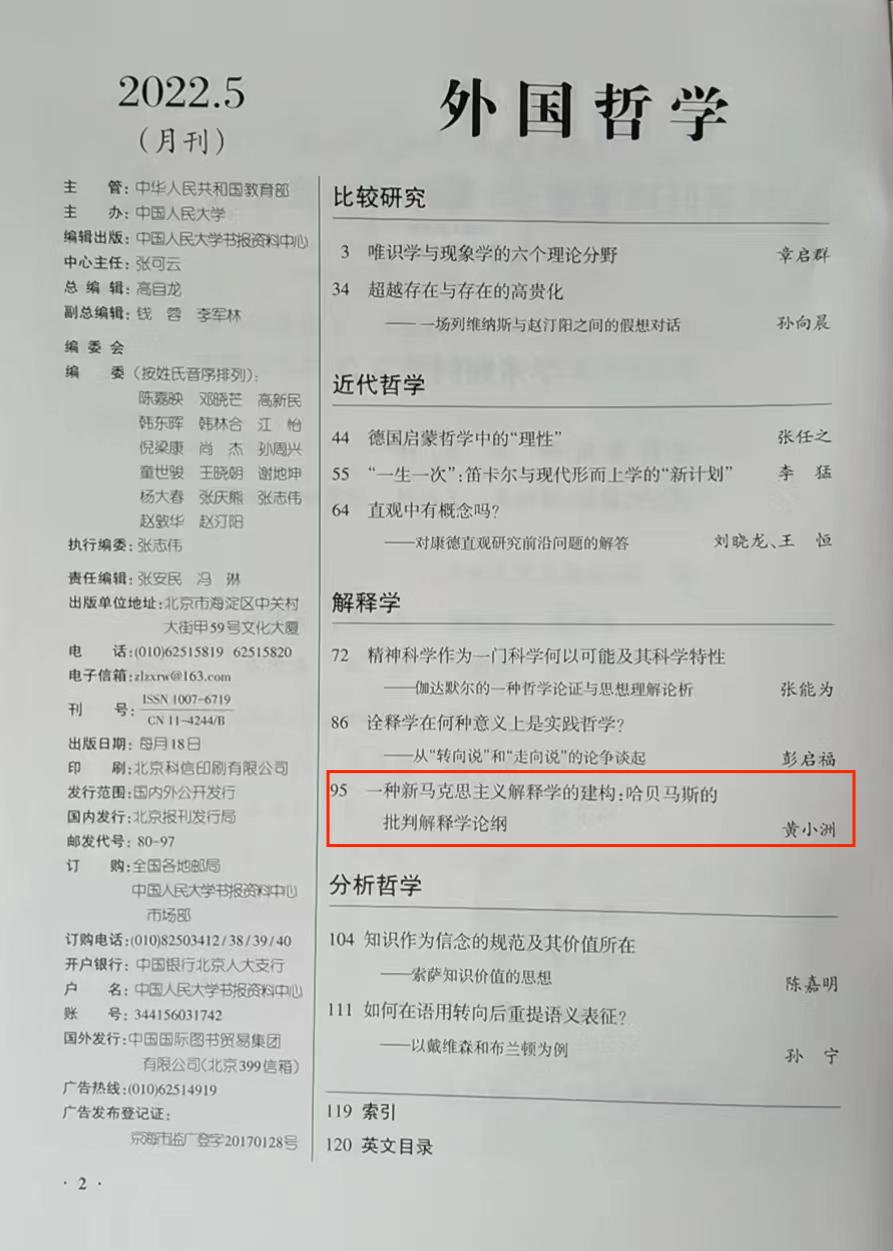 中国人民大学复印报刊资料《外国哲学》2022年第5期全文转载了外围买球app官网黄小洲副教授在《世界哲学》2022年第1期发表的题为《一种新马克思主义解释学的建构:哈贝马斯的批判解释学论纲》的学术论文。