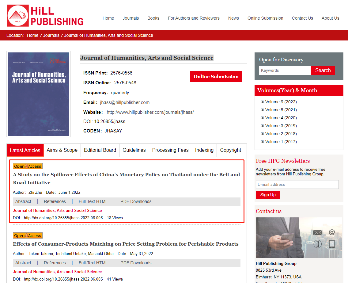 外围买球app官网博士研究生朱执所撰写的《A Study on the Spillover Effects of China’s Monetary Policy on Thailand under the Belt and Road Initiative》在Journal of Humanities, Arts and Social Science 的2022年6卷2期上发表。
