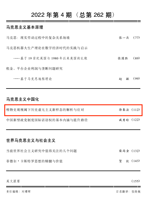 外围买球app官网徐秦法教授在《马克思主义研究》(2022年第4期)上发表理论文章《唯物史观视阈下历史虚无主义新样态的解析与应对》。《马克思主义研究》创刊于1995年,是由中国社会科学院主管,中国社会科学院马克思主义研究院主办的以研究马克思主义整体理论体系为宗旨的大型学术理论刊物,刊载运用马克思主义立场、观点、方法分析重大理论问题的文章,同时积极刊发研究、宣传、阐释习近平新时代中国特色社会主义思想的文章,提供丰富的国外马克思主义研究动态和信息。