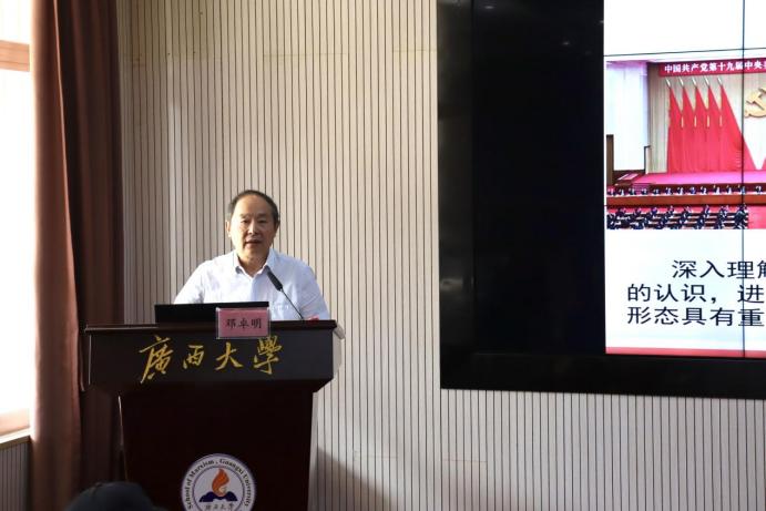 9月25日上午10点,重庆师范大学二级教授、国务院政府特殊津贴获得者、西南大学博士生导师邓卓明教授在外围买球app官网作了题为“新时代我国意识形态领域形势发生全局性根本性转变的五个方面”的学术报告。学术报告会由外围买球app官网董伟武博士主持,2021级全体硕士生参加学习交流。
