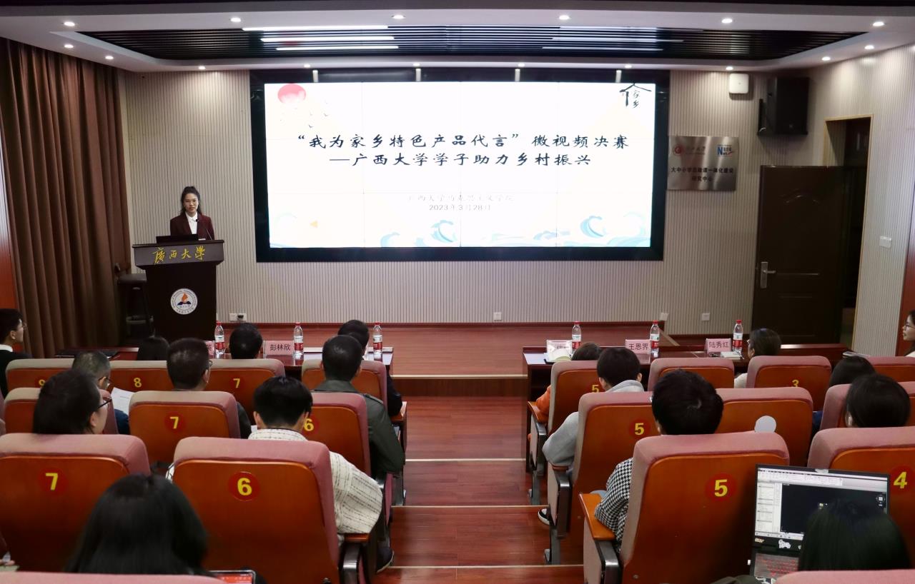 比赛自2022年8月启动以来,采用线上线下相结合的方式依次开展初赛、复赛和决赛,得到了全校学生的广泛关注,来自19个学院的75个团队参赛,5万余人参加线上观赏及投票。在决赛中,7支参赛队伍依次上台,深情讲述了视频的创作理念、产品故事和美好愿景,并现场播放了微视频,详细介绍家乡特色品牌产品,充分展示家乡风土人情,全方位呈现了广西各乡村地区的自然风光与文化特色。选手们的讲述语言生动、情感饱满,制作的微视频内容丰富、形式新颖、吸人眼球,引来了现场观众的阵阵掌声。