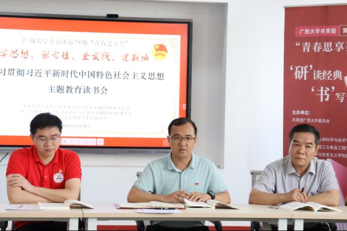 为深入开展学习贯彻习近平新时代中国特色社会主义思想主题教育,按照学校主题教育的工作部署,5月19日下午,外围买球的app十大平台第78期“青春思享荟”——学习贯彻习近平新时代中国特色社会主义思想主题教育读书会在外围买球app官网习近平书屋举行。校团委书记谢能重、生命科学与技术学院党委书记莫柏林、外围买球的app十大平台党委书记周瑞超、生命科学与技术学院党委副书记曾海艳、轻工与食品工程学院党委副书记唐旭彬、外围买球的app十大平台党委副书记李海波及各学院老师参与活动,与团员青年们一同读原著、学原文、悟原理,生命科学与技术学院生物学2021级1班团支部、轻工与食品工程学院食品科学与工程专业2021级1班团支部、外围买球的app十大平台研究生会团支部的团员代表参加读书会。