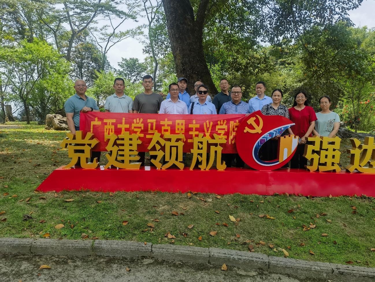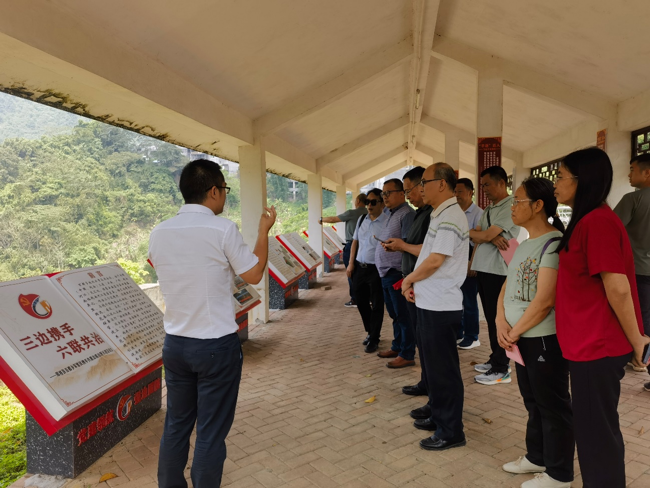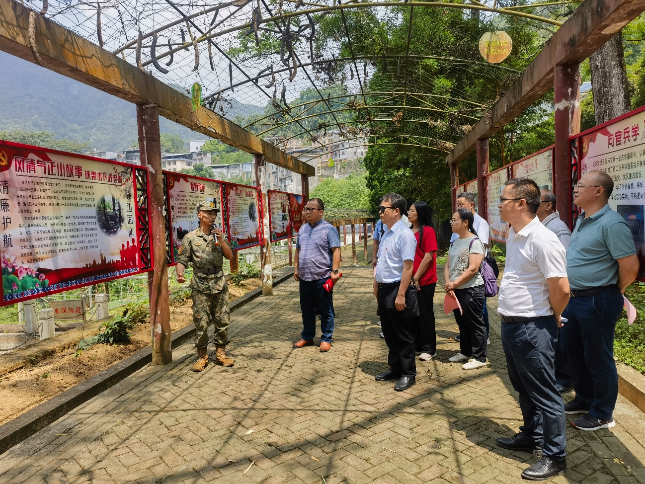 概论党支部调研组考察百色市那坡县百都乡边关军地共建廉政教育基地,在廉政教育体验活动中,大家边走边看边听,表示要保持为民务实清廉的政治本色,坚决反对和防止腐败,始终牢记肩上责任,时刻保持清醒头脑,切实做到防微杜渐、廉洁自律。近年来,百都乡在“边关党旗红”党建品牌创建活动中,携手云南省富宁县田蓬镇、板仑等乡(镇)开展跨省(区)党建联建,整合平孟口岸、联检、军警、边贸公司及抵边村等10个村、8个驻边单位部门党组织构建联合“大党委”,构建防范有效、打击有力、管理规范、保障到位的军警民治安联防体系和党建工作一体化的新格局,进一步夯实边境和谐稳定基石。跨省(区)党建联建定期召开会议,积极组织开展群众性文体联谊活动,以党建统筹引领村村、村警、军地党支部联建共建,实现乡村振兴得助力、经贸产业得发展、交界地区得安宁的良好局面。