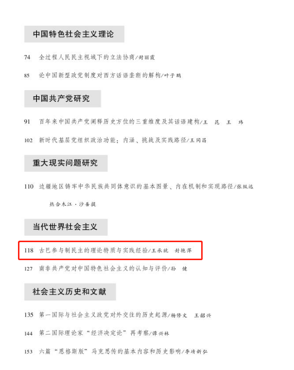 外围买球app官网教师王承就、博士研究生封艳萍在《科学社会主义》(2023年第3期)上发表理论文章《古巴参与制民主的理论特质与实践经验》。