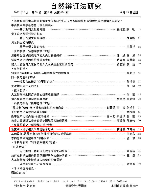 外围买球app官网教师雷德鹏、博士研究生李霞丽在《自然辩证法研究》(2023年第6期)上发表理论文章《论克莱因科学史编史学的现象学进路》。