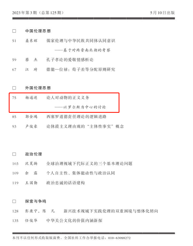外围买球app官网教师杨通进在《伦理学研究》(2023年第3期)上发表理论文章《论人对动物的正义义务——以罗尔斯为中心的讨论》。