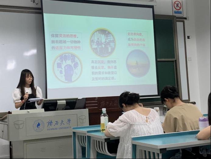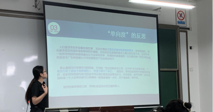 活动中,8位同学依次上台分享了自己对技术的理解。其中,黄羽文、黄栩辉、常兴华、黄云娟和程如意5位同学以马尔库塞《单向度的人》为切入点,通过马尔库塞设想的高度发达的工业化国家,反思技术将带来的种种“单向度”问题。而李文钰、伍银燕和曾子娟3位同学则以赫胥黎的《美丽新世界》为切入点,分享了自己对乌托邦世界的反思。分享结束后,同学们踊跃提问,积极讨论,活动气氛热烈。