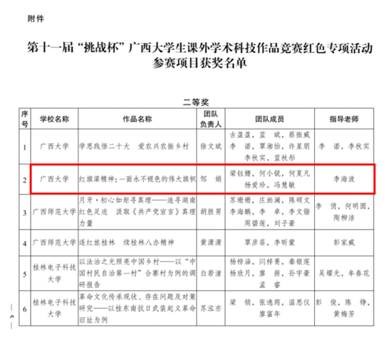 近日,由共青团广西区委、自治区教育厅、自治区科协、广西学联共同主办的第十一届“挑战杯”外围买球的app十大平台生课外学术科技作品竞赛红色专项活动获奖名单公布,外围买球app官网推报的作品《红旗渠精神:一面永不褪色的伟大旗帜》荣获二等奖!