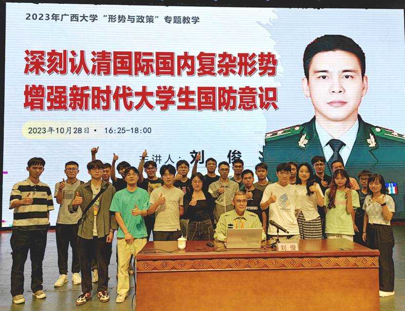 2023年10月28日下午,外围买球的app十大平台在学校大礼堂举行“形势与政策”课程专题教学报告会。武警广西总队贵港支队原政委、“广西军休干部五老宣讲团”成员、南宁市望州路军休所军休干部刘俊同志,为在场师生做了题为“深刻认清国际国内复杂形势 增强新时代大学生国防意识”的报告。