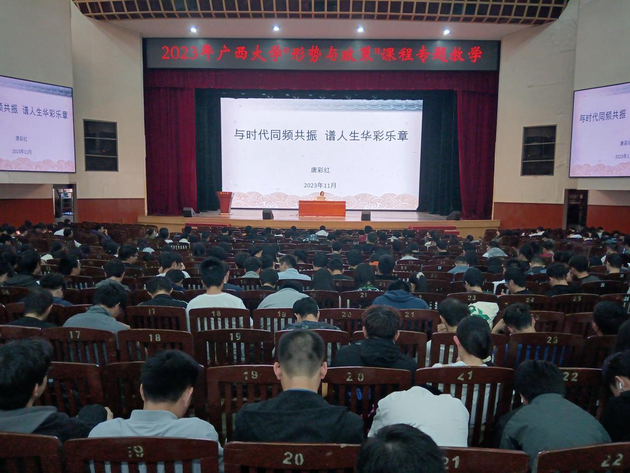 2023年11月18日下午,我校大礼堂举行了“形势与政策”课程专题教学报告会。南宁广播电视台融媒体中心主任、南宁市委讲师团特聘专家(教授)唐彩红主任记者为到场师生做了题为“与时代同频共振 谱人生华彩乐章”的报告。