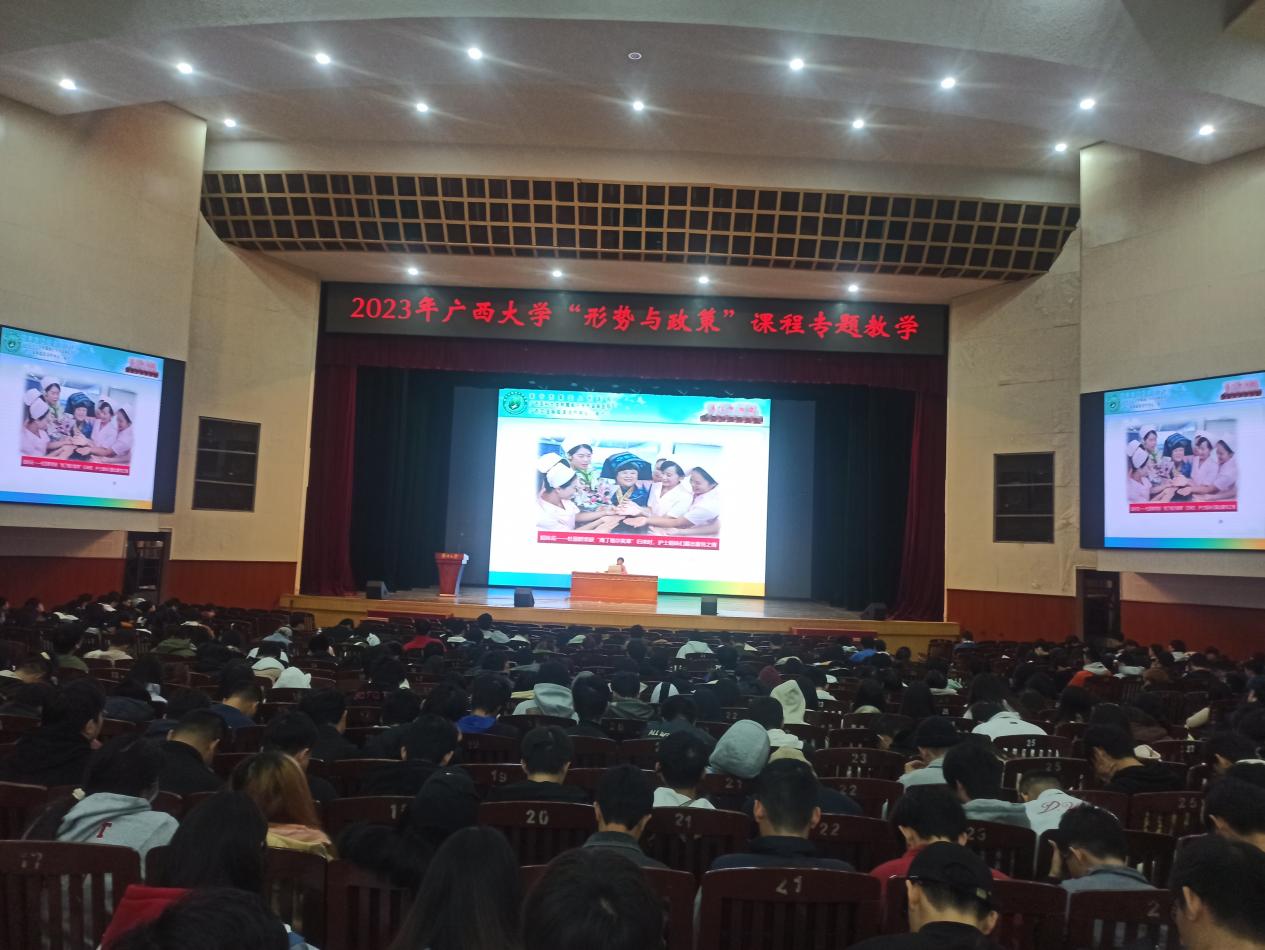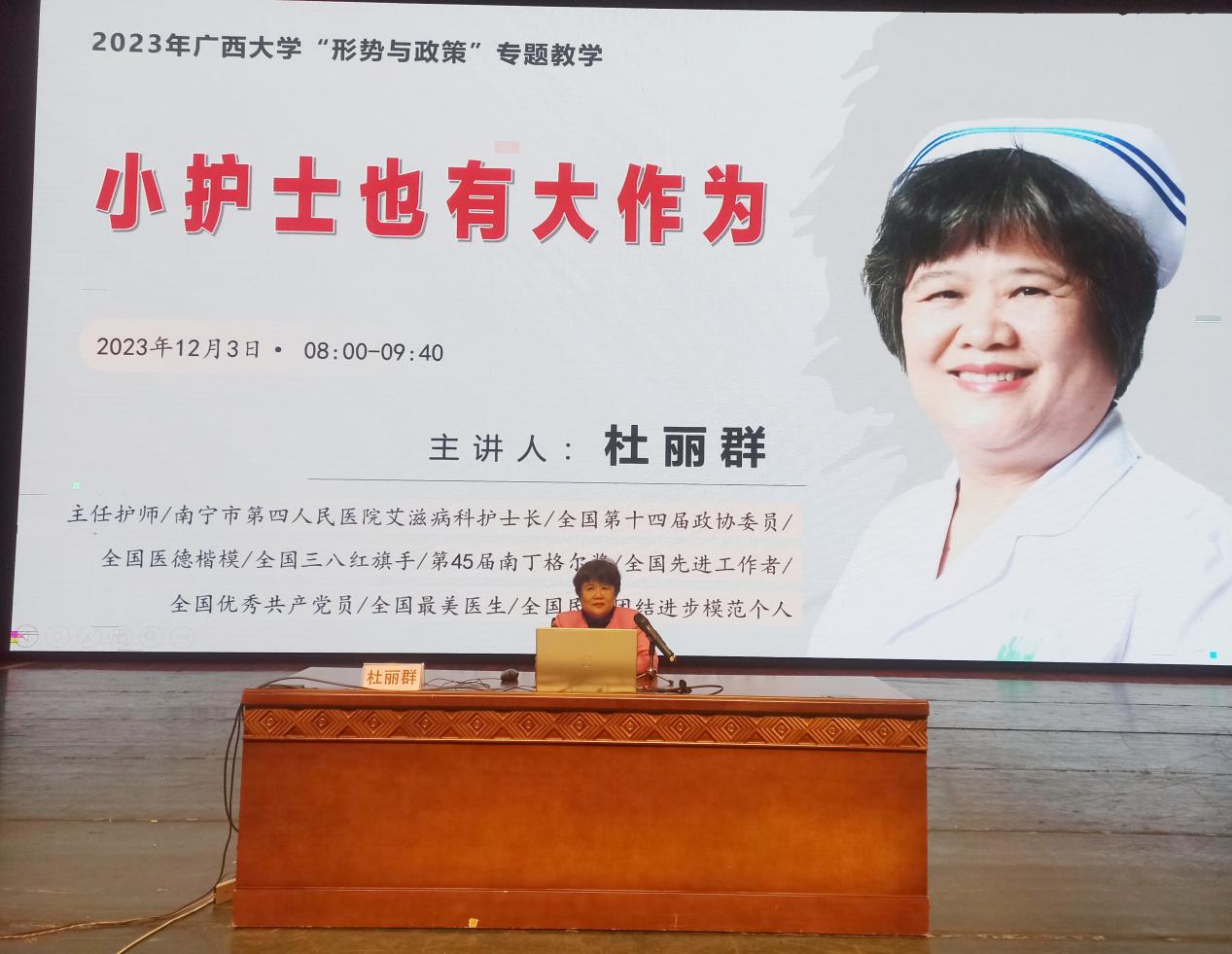 12月3日,2023年外围买球的app十大平台“形势与政策”专题教学报告会在我校大礼堂如期举行。此次报告会特邀中国共产党第十九次全国代表大会代表、全国第十三届政协委员、南宁市第四人民医院艾滋病科护士长、主任护师杜丽群做“小护士也有大作为”的主题报告。