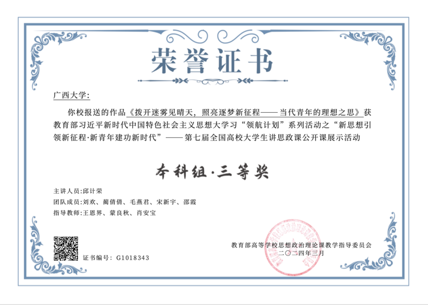 外围买球app官网选送作品《拨开迷雾见晴天,照亮逐梦新征程——当代青年的理想之思》荣获本科组三等奖,该作品由王恩界、蒙良秋、肖安宝老师指导,邱计荣主讲,团队成员为刘欢、蔺倩倩、毛燕君、宋新宇、邵霞。