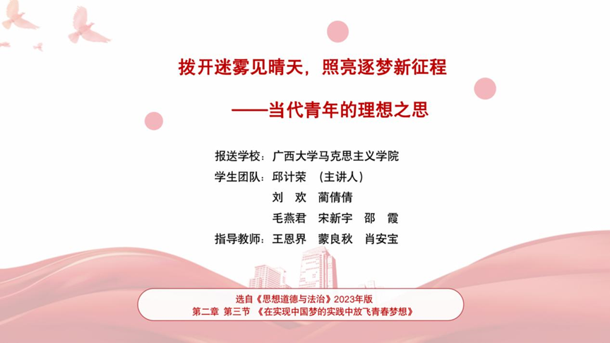 参赛团队选取了《思想道德与法治》2023年版中的第二章第三节《在实现中国梦的实践中放飞青春梦想》,以“当代青年的理想之思”为核心议题,深入探讨了青年在实现中国梦进程中的重要角色与担当。他们结合教材中的“理想与现实的辩证统一”这一知识点,借助一系列视频资料和案例导入青年躺平现象,从不同层面剖析了“躺平青年之困”,揭示了其背后的社会、心理等多重原因;探讨了“觉醒青年之迷”,鼓励青年认清自我,找寻内心深处的理想与追求;强调了“奋斗青年之进”,激励广大青年积极投身于国家建设与发展,为实现中国梦贡献无悔的青春。总之,该参赛团队通过引领青年走出迷茫,重燃青春激情,坚定理想信念,增强新时代青年的责任感与使命感,为实现中华民族伟大复兴不懈努力。