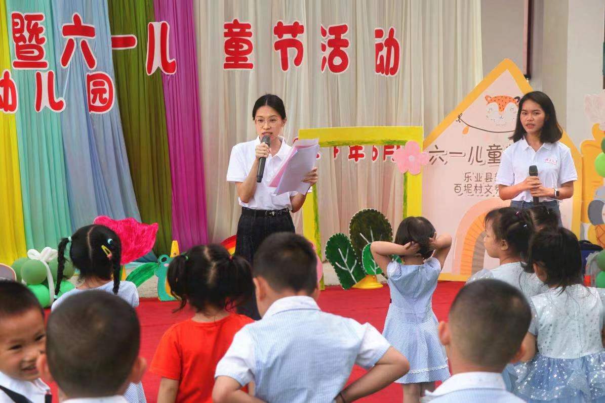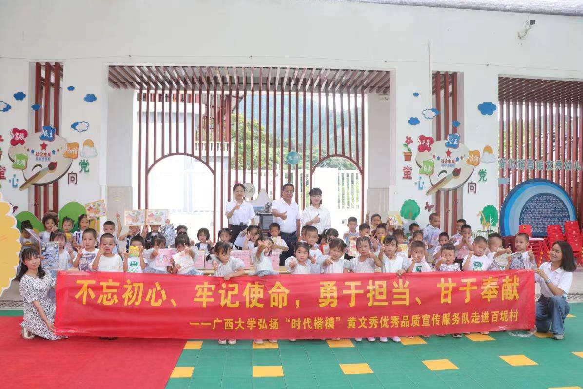 5月31日,外围买球的app十大平台弘扬“时代楷模”黄文秀优秀品质宣传服务队走进百色市乐业县百坭村文秀幼儿园与小朋友们同庆“六一”,开展“童心向党,幸福成长”主题活动,并向幼儿园捐赠图书绘本和校园文创。