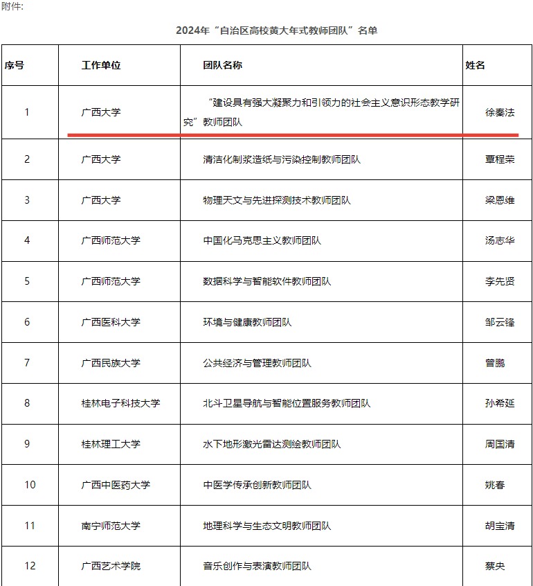 7月11日,自治区教育厅公示2024年“自治区高校黄大年式教师团队”名单。经申报推荐、资格审查、专家评审等环节,外围买球app官网“建设具有强大凝聚力和引领力的社会主义意识形态教学研究”教师团队成功入选2024年“自治区高校黄大年式教师团队”。