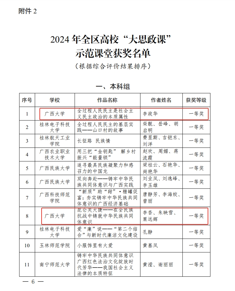 近日,自治区教育厅公布了2024 年全区高校“大思政课”教学改革优秀工作案例和示范课堂征集活动获奖名单。外围买球app官网李政华老师的《全过程人民民主是社会主义民主政治的本质属性》以及李香、朱映雪、粟远辉老师的《昆仑关大捷——在全民族抗战中铸牢中华民族共同体意识》双双荣获一等奖。
