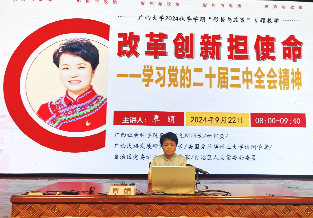 金秋送爽,硕果累累。2024年9月22日,在祖国即将迎来七十五周年华诞之际,我校2024年秋季“形势与政策”课程专题教学报告会拉开了帷幕。广西社会科学院民族研究所所长、研究员,广西社会科学院铸牢中华民族共同体意识研究基地主任覃娟同志为同学们作了题为“改革创新担使命——学习党的二十届三中全会精神”的专题教学报告。