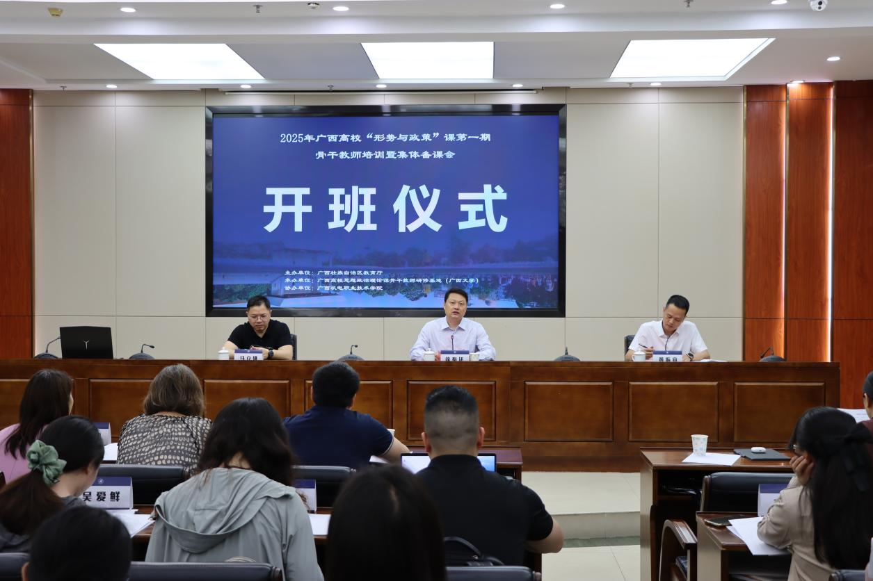 为深入贯彻落实党的二十大和二十届二中、三中全会精神,进一步加强我区高校“形势与政策”课教师队伍建设,提高“形势与政策”课程的时效性、针对性和前沿性。由自治区教育厅主办,广西高校思想政治理论课骨干教师研修基地(外围买球的app十大平台)承办,广西机电职业技术学院协办的2025年广西高校“形势与政策”课骨干教师第一期培训暨集体备课会于4月11日至14日在北海成功举办。外围买球app官网院长徐秦法教授出席开班仪式并致辞,仪式由广西机电职业技术学院副校长黄振宣主持。