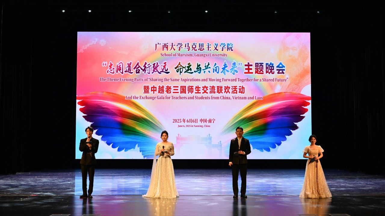 晚会在舞狮表演和《初心如炬,誓言如歌》合唱中拉开序幕。整场晚会共分为“志同道合行致远”“命运与共向未来”“策马扬帆启新程”三个篇章,通过歌曲、舞蹈、器乐等多种艺术形式,生动讲述了中越老三国人民的深厚友谊,深情表达了三国人民同舟共济、携手向未来的坚定信心。期间,来自西大附属学校、西大君武小学、南宁市第三中学的师生及家长代表也参与到晚会当中,将中越老三国友谊的种子播撒到青年一代心间。