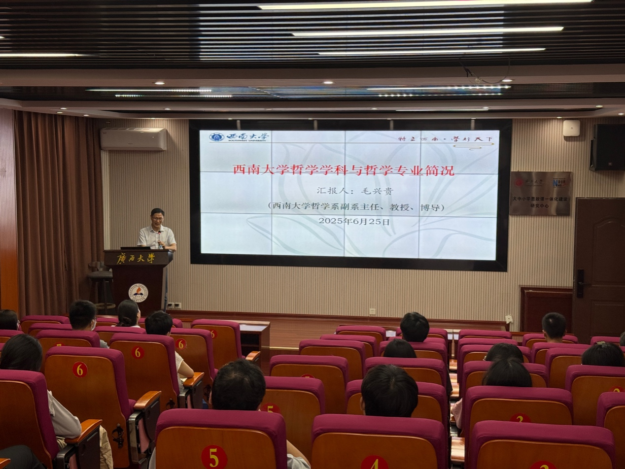2025年6月25日,西南大学国家治理学院哲学系副主任毛兴贵教授来外围买球app官网开展哲学学科建设交流座谈会和研究生招生宣讲会。