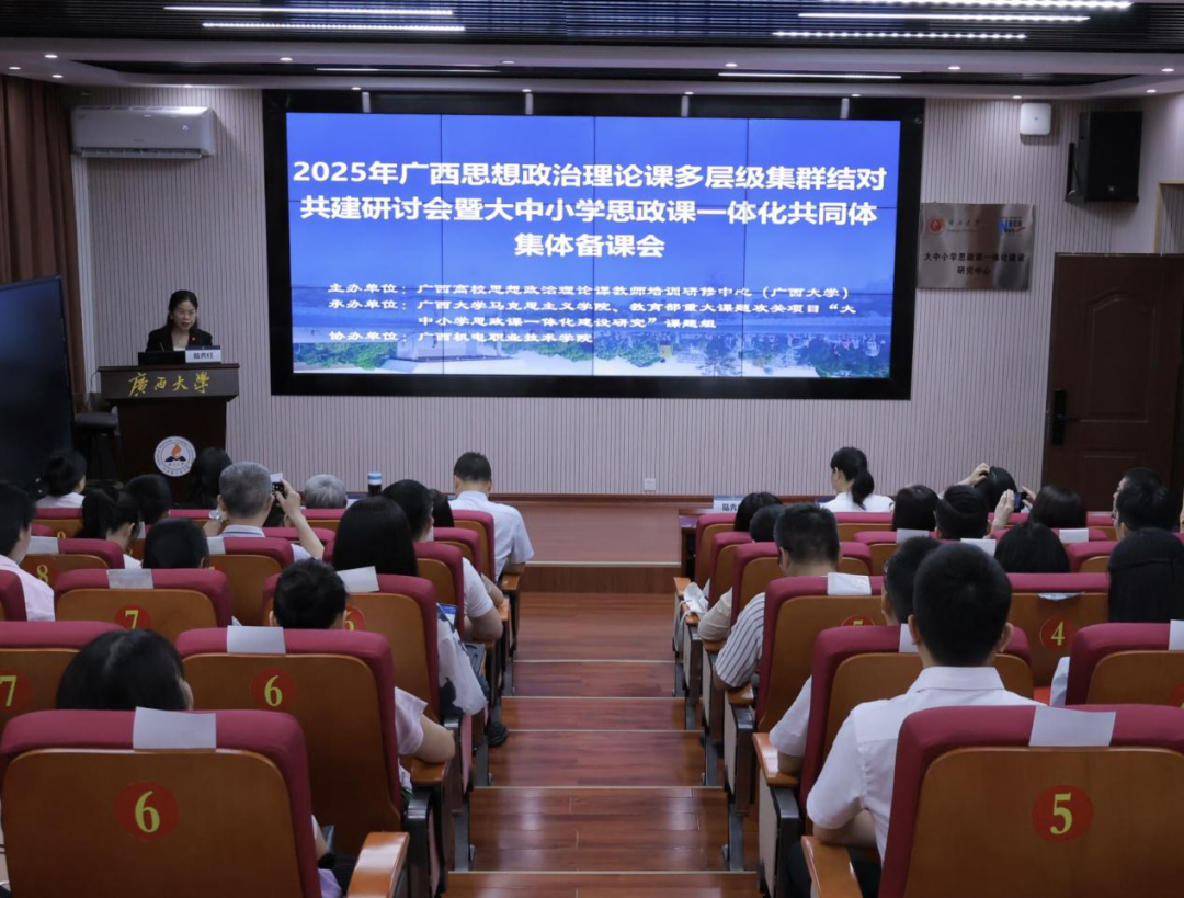 为推进我区大中小学思政课一体化高质量发展,助力各结对共建高校更好地参与“第四届全国高校思想政治理论课教学展示活动”,7月5日,由广西高校思想政治理论课教师培训研修中心(外围买球的app十大平台)主办,教育部重大课题攻关项目“大中小学思政课一体化建设研究”课题组承办的2025年广西思想政治理论课多层级集群结对共建研讨会暨大中小学思政课一体化共同体集体备课会在外围买球app官网举行。外围买球的app十大平台校长助理、外围买球的app十大平台院长徐秦法出席开幕仪式并致辞,外围买球的app十大平台副院长陆秀红主持开幕仪式。