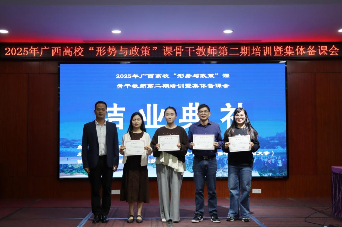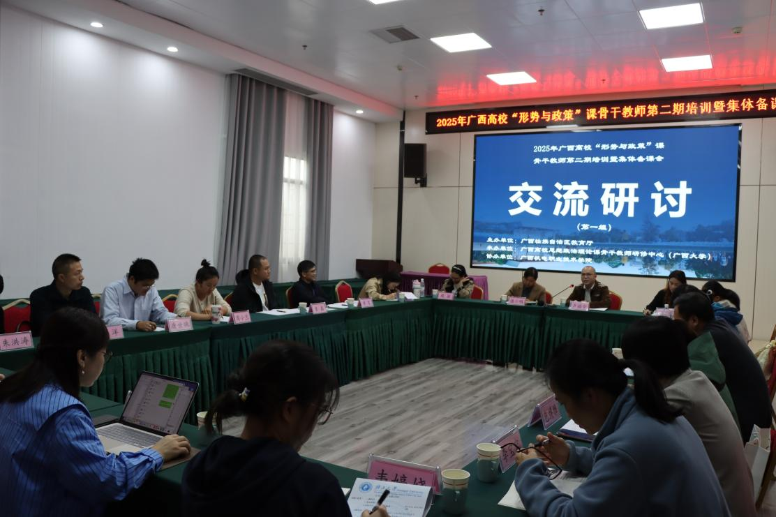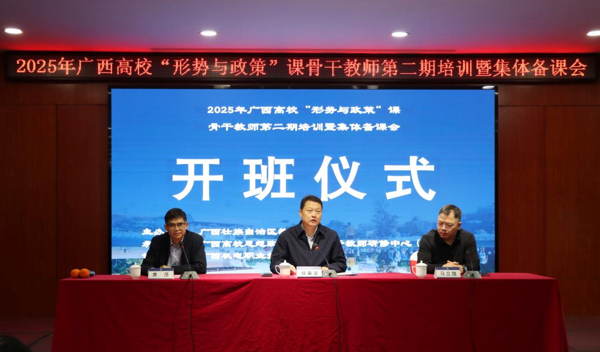 为深入贯彻党的二十大和二十届二中、三中、四中全会精神,持续推进广西高校 “形势与政策” 课程教师队伍专业化建设,全面提升课程的时效性、针对性与前沿性,2025年10月31日至11月3日,由广西壮族自治区教育厅主办、广西高校思想政治理论课骨干教师研修基地(外围买球的app十大平台)承办、广西机电职业技术学院协办的 2025 年广西高校 “形势与政策” 课骨干教师第二期培训暨集体备课会在柳州成功召开。外围买球app官网院长徐秦法教授出席开班仪式并致辞,仪式由广西财经学院外围买球的app十大平台副院长黄茂主持。