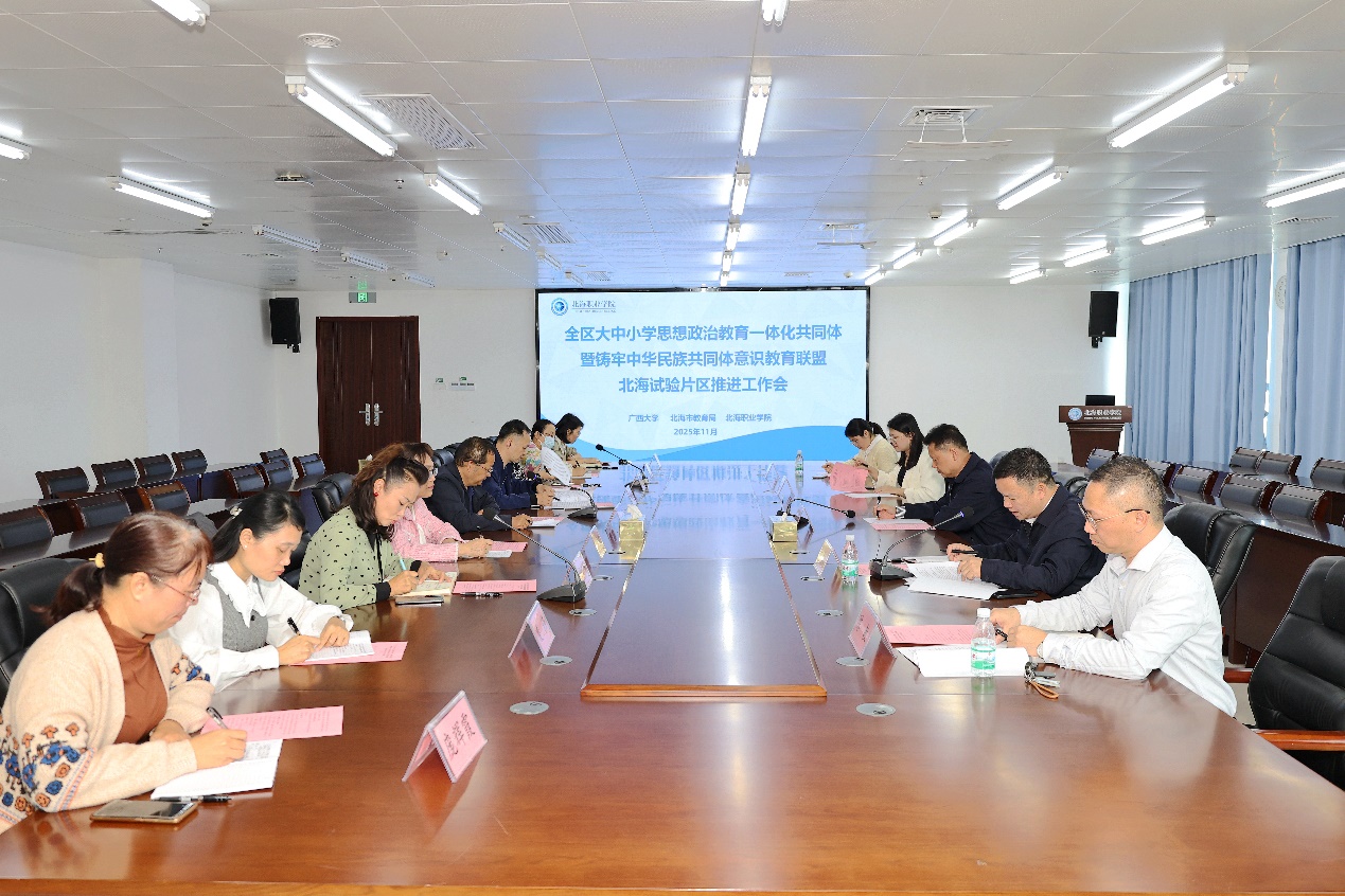 11月14日,为落实自治区大中小学思想政治教育一体化共同体暨铸牢中华民族共同体意识教育联盟工作要求,推动北海试验片区工作进展,外围买球app官网院长徐秦法带队赴北海职业学院,参加全区大中小学思想政治教育一体化共同体暨铸牢中华民族共同体意识教育联盟北海试验片区工作推进会。北海职业学院校党委委员、副校长张钺出席会议并担任主持人,牵头单位北海市教育局以及北海职业学院相关部门人员共同参会。