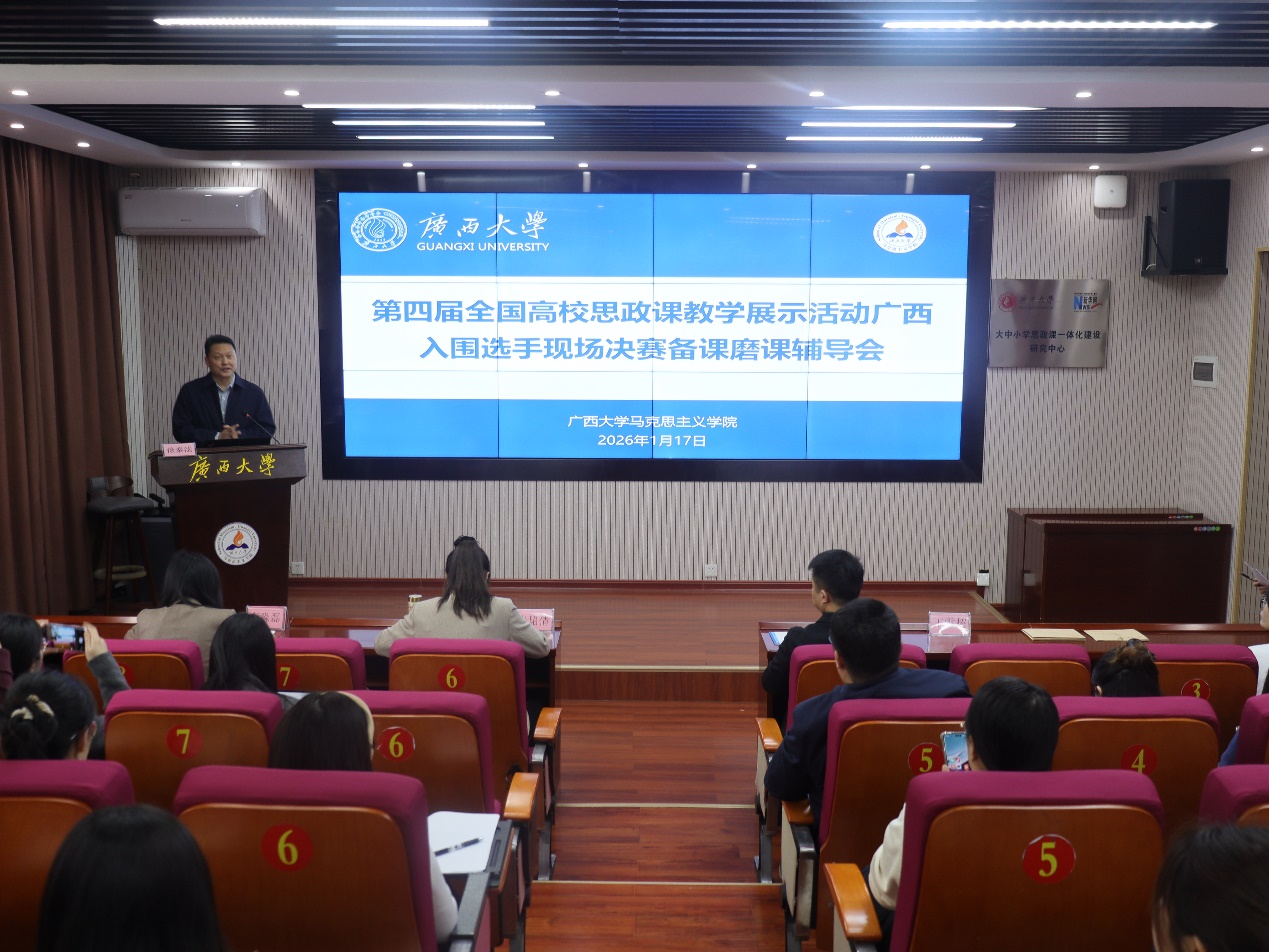 1月17日,第四届全国高校思政课教学展示活动广西入围选手现场决赛备赛磨课辅导会在外围买球app官网举行。本次辅导会由自治区党委教育工委、教育厅主办,外围买球的app十大平台承办,旨在贯彻落实教育部社科司关于“各省级教育部门要帮助入围教师制定备赛方案,提供全方位、高质量的备赛保障”的要求,进一步提升我区入围选手的教学竞赛水平,增强现场应对能力。会议特邀教育部教学展示特等奖获得者天津师范大学外围买球的app十大平台副院长王雪超教授、河南财政金融学院张珺倩副教授、中南大学李淼磊副教授莅临指导。外围买球的app十大平台校长助理、外围买球的app十大平台院长徐秦法教授出席活动并致辞。三位决赛选手及其团队成员精心磨课,北部湾大学、广西机电职业技术学院等6所结对共建高校的骨干教师与外围买球app官网教师代表齐聚一堂,观摩学习,以学促建。