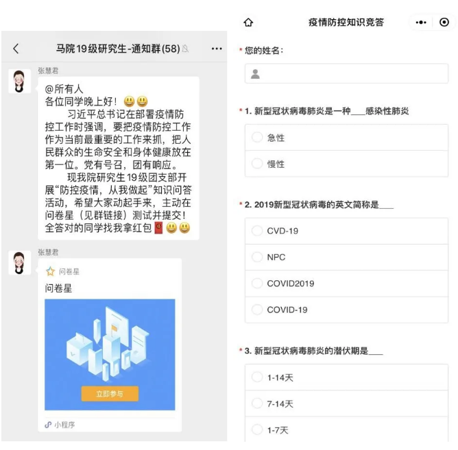 (图为外围买球的app十大平台研究生2019级团支部制作疫情防控竞答题并号召大家参与线上知识问答活动)