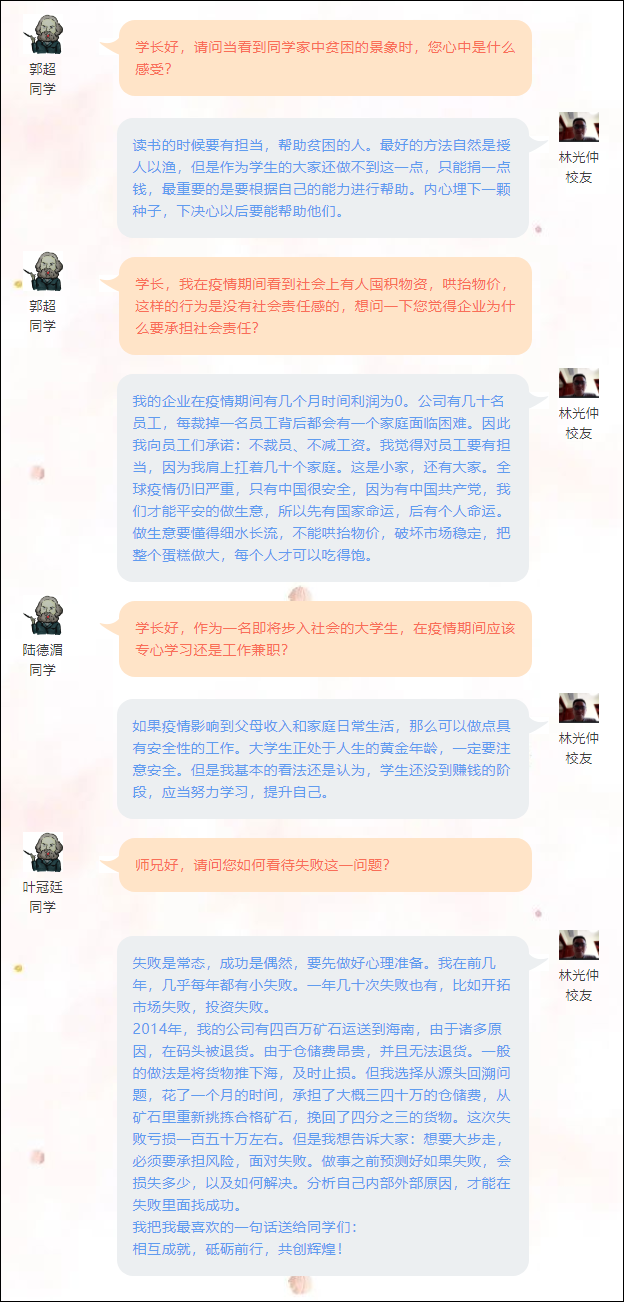 6月2日上午,广西金之海矿产品有限公司创始人、外围买球的app十大平台2008届校友、曾任外围买球的app十大平台大学生就业与职业发展协会会长林光仲受外围买球的app十大平台邀请,走进云课堂与哲学181班同学畅谈“创业者的担当品质”,分享个人感悟与经验。