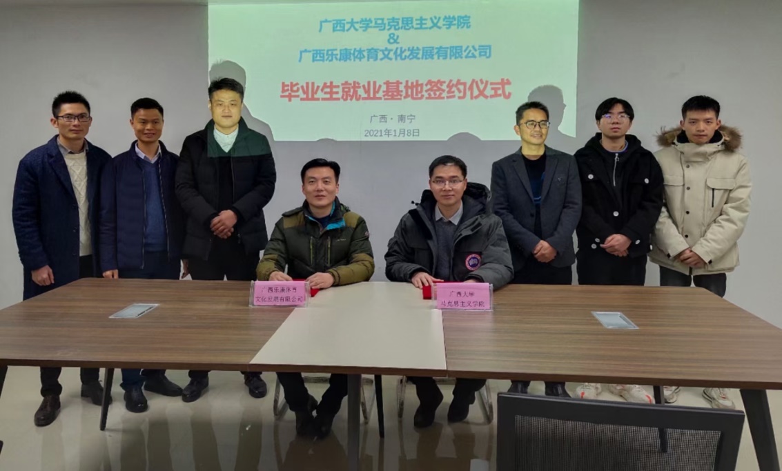 1月8日下午,外围买球app官网党委副书记李海波一行到广西乐康体育文化发展有限公司参观考察,并参加“外围买球的app十大平台毕业生就业基地”签约和揭牌仪式。广西乐康体育文化发展有限公司领导及员工代表、外围买球的app十大平台师生代表等参加活动。