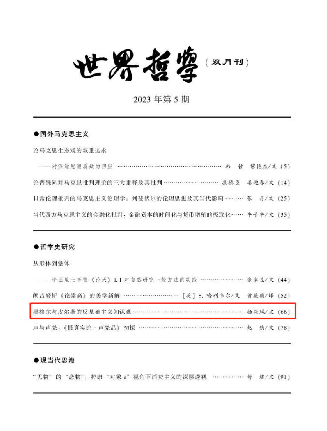 外围买球app官网教师杨兴凤在《世界哲学》(2023年第5期)上发表理论文章《黑格尔与皮尔斯的反基础主义知识观》。