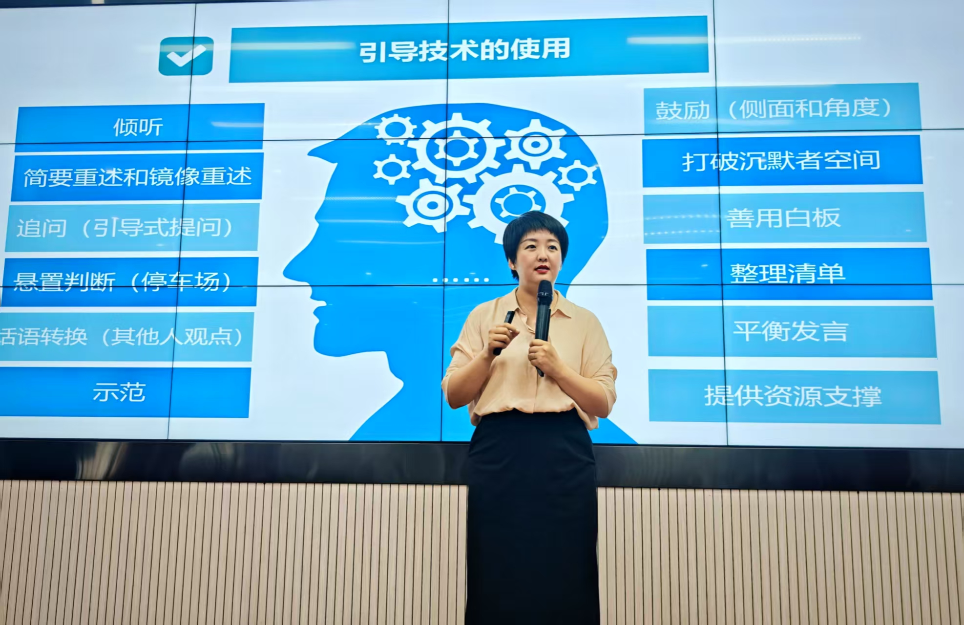28日上午在君武馆第二会议室,田岚洁博士进行结构化研讨教学展示,她围绕“高校思政课教学中的问题与对策研究”,组织与会教师开展结构化研讨。老师们分成多个学习小组,在田岚洁博士的指导下,依次进行角色分配、梳理问题、聚焦问题、对策共创和交流分享。期间,运用卡片式头脑风暴、团队列名、收纳术、集体决策、评估象限等工具引导各个小组形成问题清单,并运用鱼骨图工具进行原因分析和对策研究。整个教学过程气氛活跃,教师参与度高、互动性强,充分体验到结构化研讨所带来的崭新教学效果。