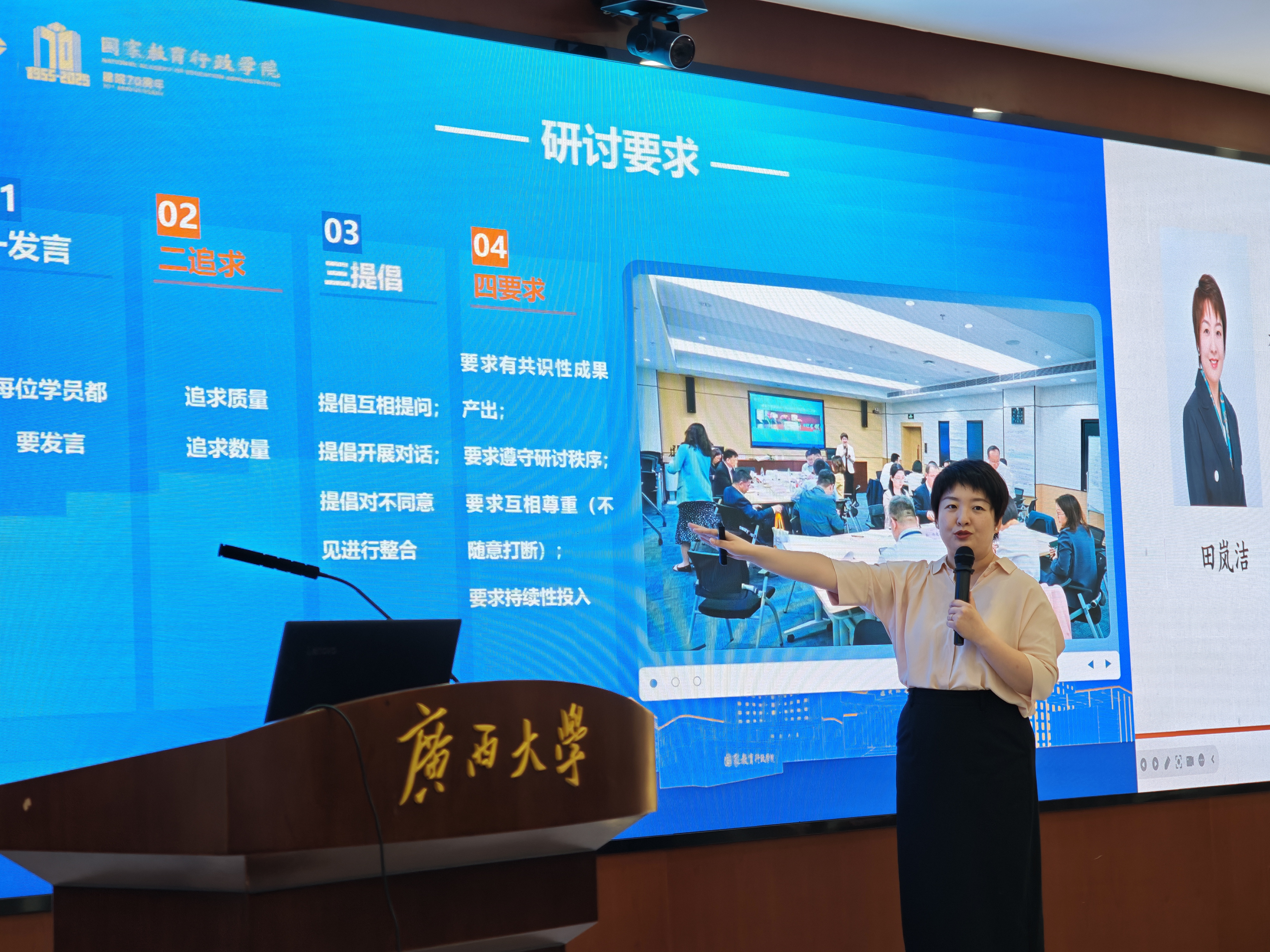 28日下午,田岚洁博士在学院101报告厅作了题为“结构化研讨的实践与探索”的专题讲座。基于上午的实践体验,田岚洁博士围绕结构化研讨进行了更为系统深入的理论讲解,包括什么是结构化研讨、为什么是结构化研讨、结构化研讨赋能思政课教学和如何设计结构化研讨等,她特别介绍了将结构化研讨融入思政课教学的典型案例,指出结构化研讨方法有助于破解思政课教学中学生抬头率低等痛点、难点问题;她介绍的结构化研讨的理论工具,为与会教师将来开展结构化研讨教学实践提供了理论依据、方法指导和工具支持。